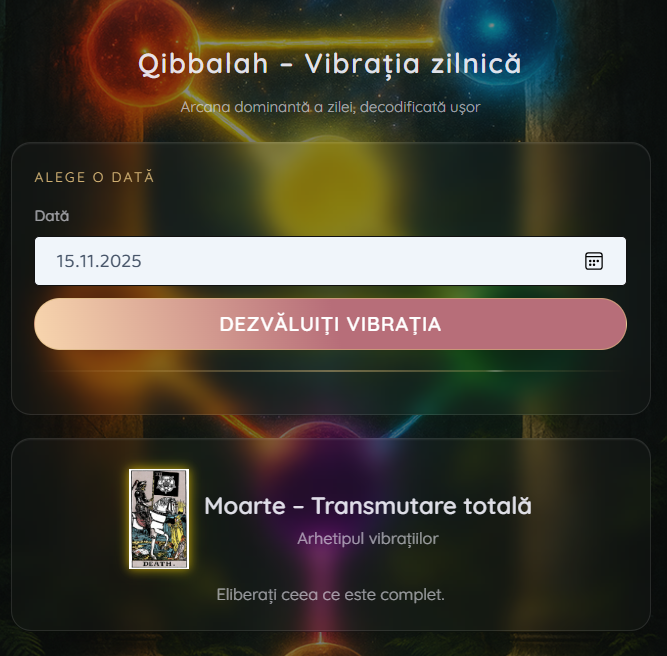Vibratia zilei de 15 noiembrie este Arcana Majora nr 13-Moartea. Aceasta inseamna finaluri si noi inceputuri, schimbare, transformare, tranzitie, inseamna sa lasam in urma trecutul care nu ne mai foloseste, sa finalizam un capitol din viata noastra dar poate insemna ca putem avea de-a face si cu ceva ce ne sperie insa si regenerare, primirea unei noi vieti.