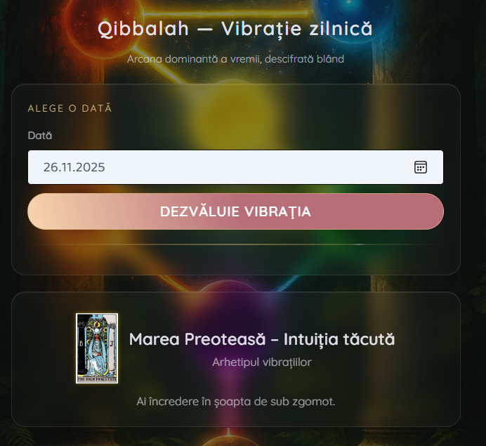 Vibratia zilei de 26 noiembrie este Arcana Majora Marea Preoteasa care inseamna intuitie puternica, cunoastere sacra, feminitatea pe care astazi ne-o putem pune in valoare noi femeile, inseamna mintea subconstienta dar poate fi si o femeie care ne poate influenta atunci cand avem de luat o decizie sau cand facem o actiune.